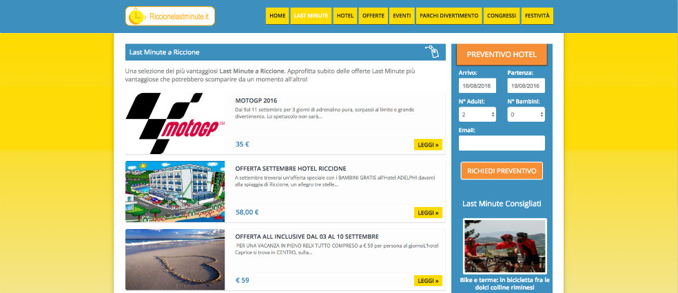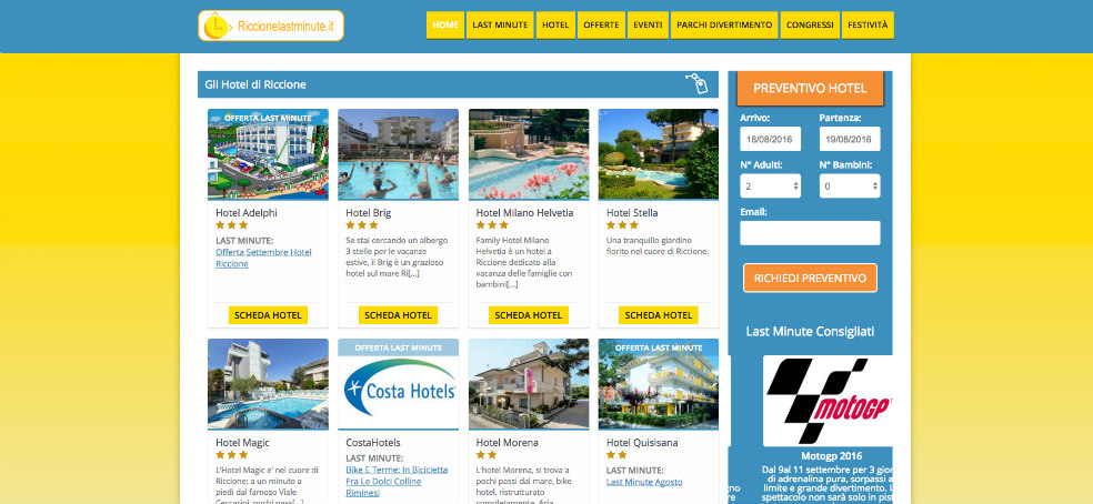 Nato nel 2003, Riccione Last Minute è un portale che offre la visibilità agli hotel con un impatto diretto grazie ad immagini di ampie dimensioni. il visitatore entrando sul portale trova direttamente le foto degli alberghi con affianco le loro offerte last minute.